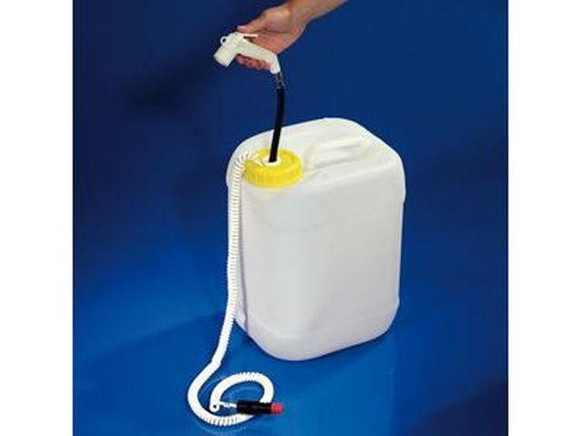 Einfachste Handhabung – Stecker in 12 V-Steckdose stecken, Schlauch aus dem Kanister ziehen, Hebel vom Brause-Handstück betätigen … und schon fließt Wasser. Ob Sie sich bei einer Reparatur die Hände schmutzig gemacht haben, Ihren Hund nach dem Spaziergang abduschen wollen, oder sich auf dem Campingplatz duschen wollen, einfach überall da, wo eine 12 V-Steckdose vorhanden ist, kann jetzt Wasser fließen. Maße (B x T x H): 255 x 290 x 390 mm.