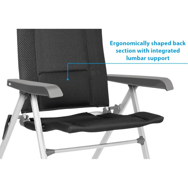 Komfortabler 4-Bein-Hochlehner mit brandneuem, platzsparendem Rahmen. Die perfekte Lösung für alle, die nicht viel Platz im Fahrzeug haben. Dank speziell angefertigter Gelenke ist es möglich, sowohl das hintere Stuhlbein als auch die Kopfstütze einzuklappen und so die Höhe des Stuhls in geschlossener Position erheblich zu reduzieren.